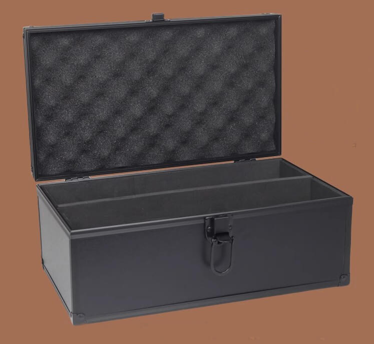 The case is shock resistant and has a locking lid, allowing for secure storage.
