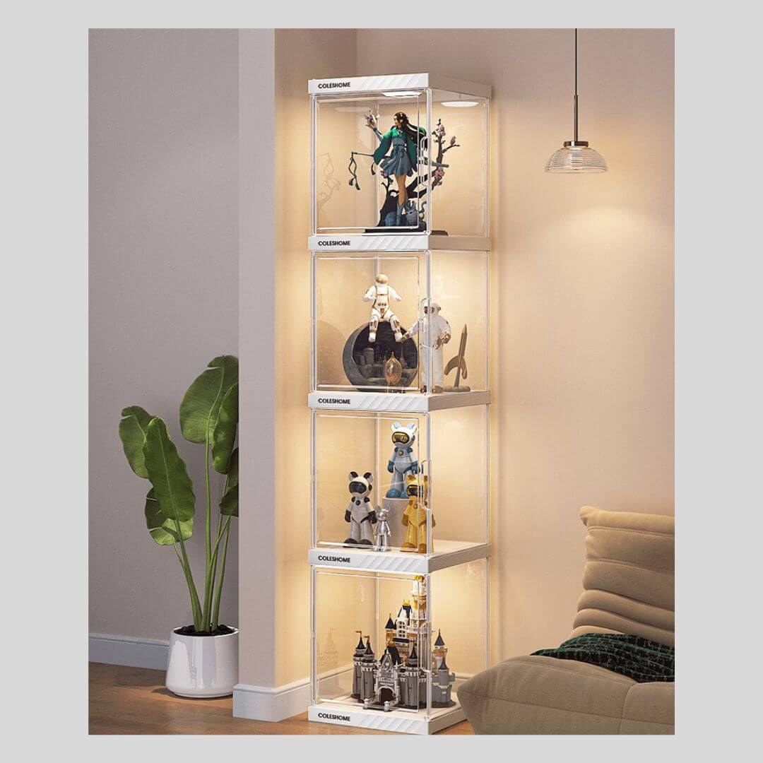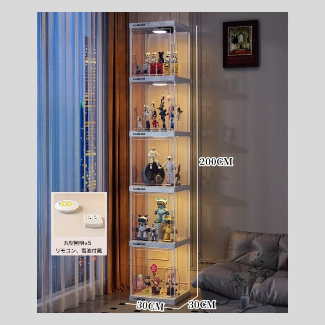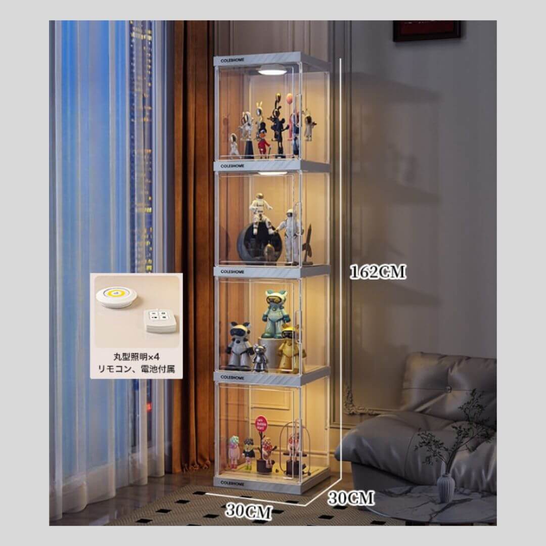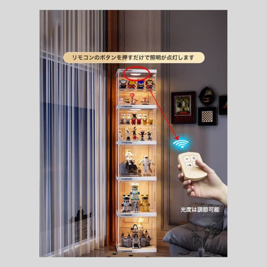 防水・防塵仕様でホコリや湿気から大切なアイテムをしっかり保護します。前面は開閉しやすい磁石扉付きで、出し入れもスムーズ。付属のリモコンで照明の明るさ調整が可能なので、飾る空間に合わせて自在に演出できます。機能性と美しさを兼ね備えた、見せる収納にぴったりの高機能ディスプレイケースです。