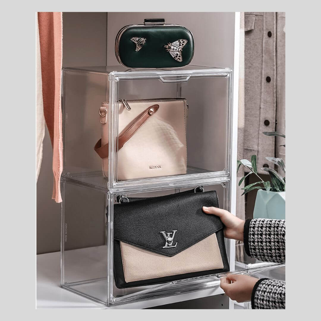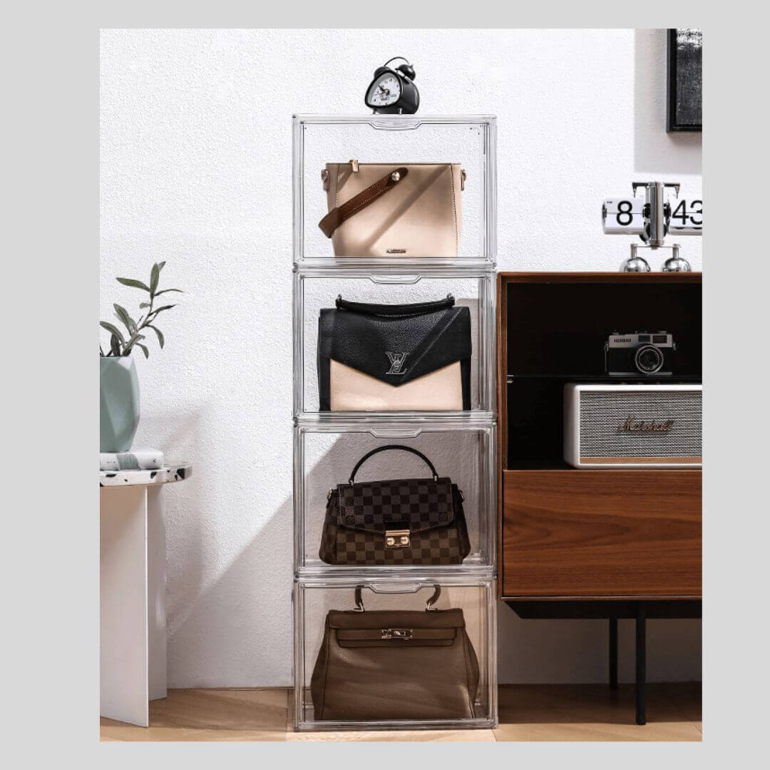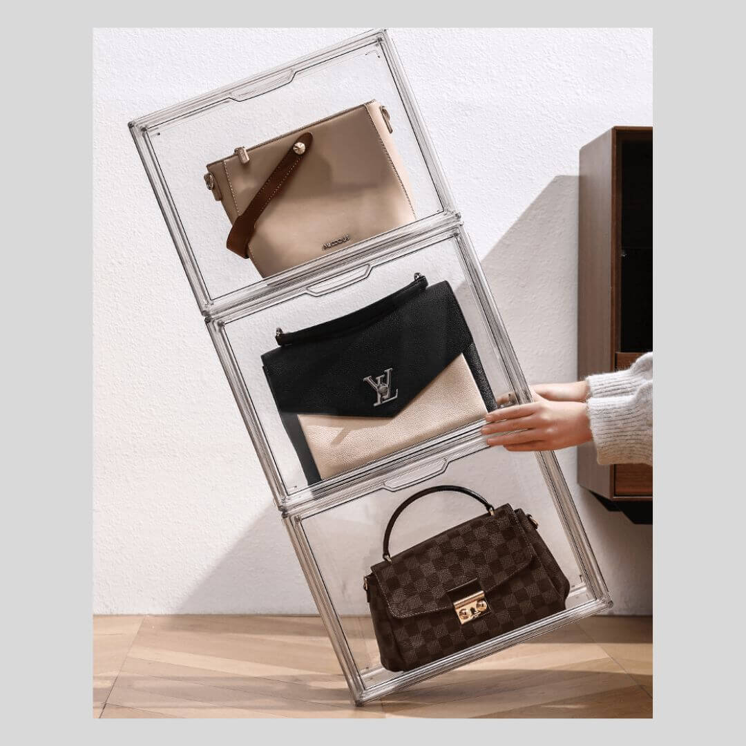 シャネルやバーキンなどのハイブランドバッグ、痛バッグの収納にも対応できる大容量のアクリルボックス。透明度の高いアクリル素材がバッグの美しさを引き立て、コレクションを魅せながら保護します。