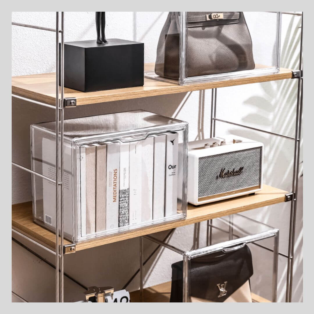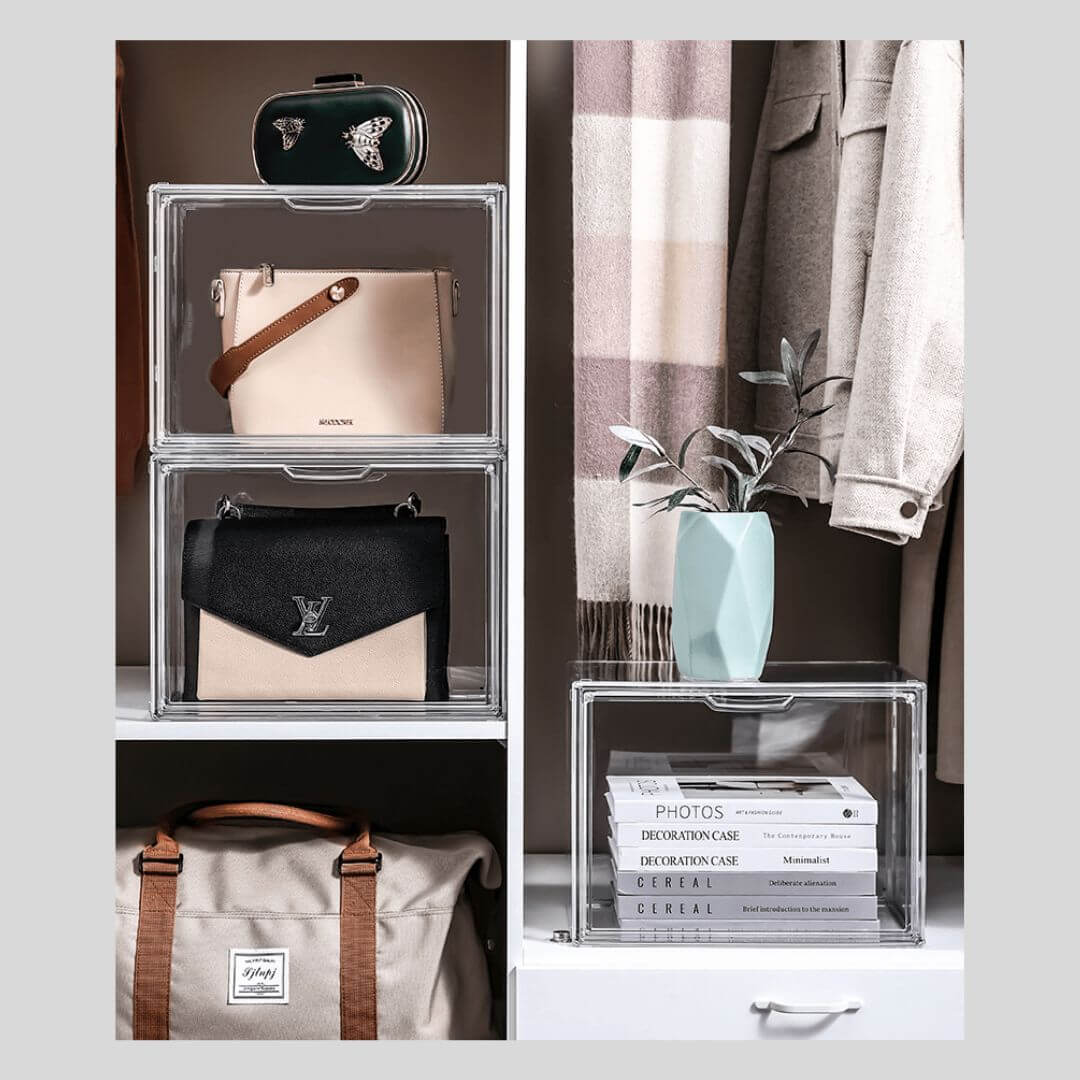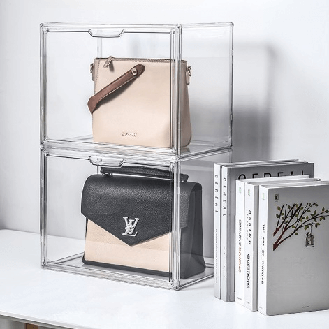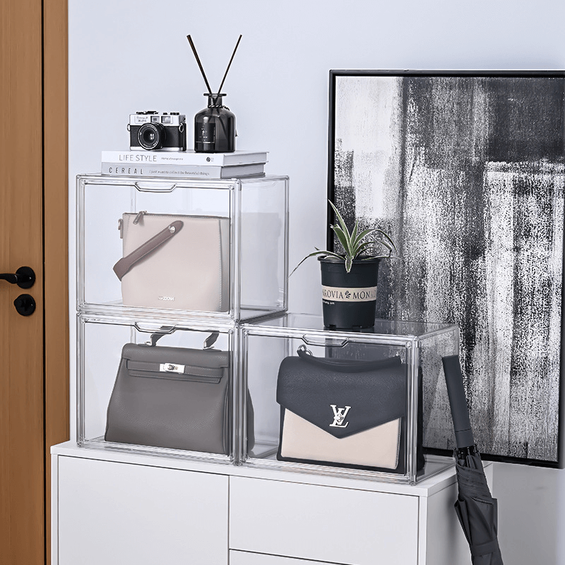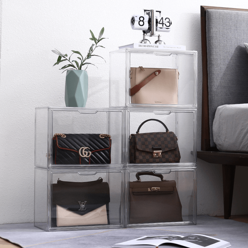 シャネルやバーキンなどのハイブランドバッグ、痛バッグの収納にも対応できる大容量のアクリルボックス。透明度の高いアクリル素材がバッグの美しさを引き立て、コレクションを魅せながら保護します。