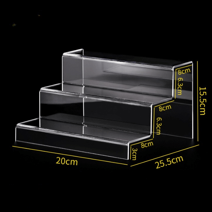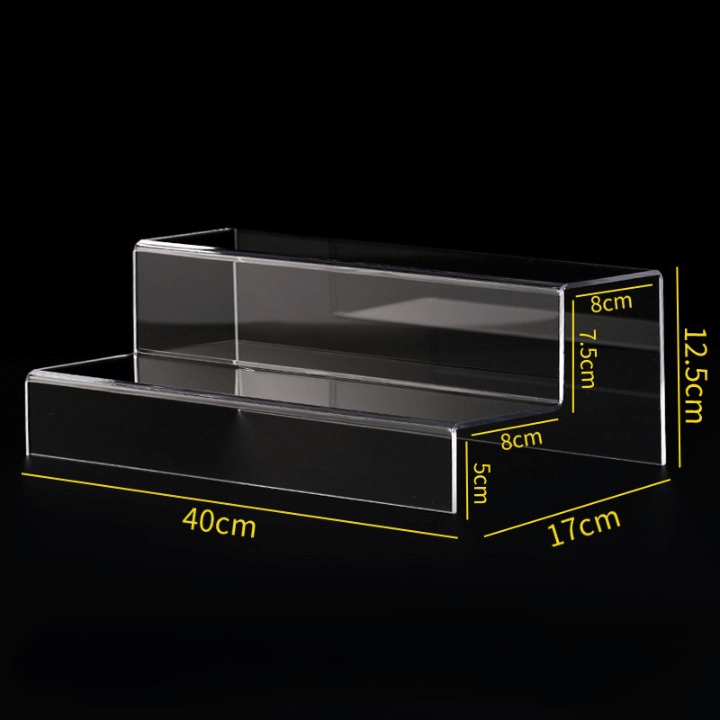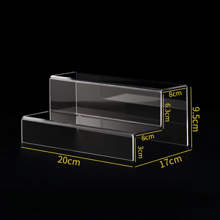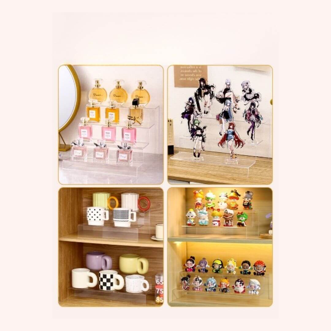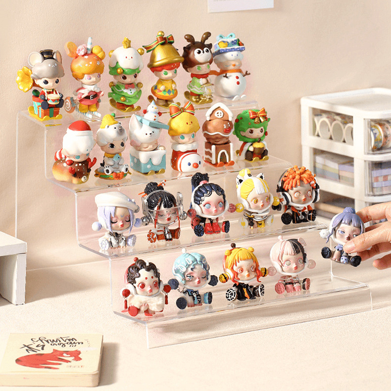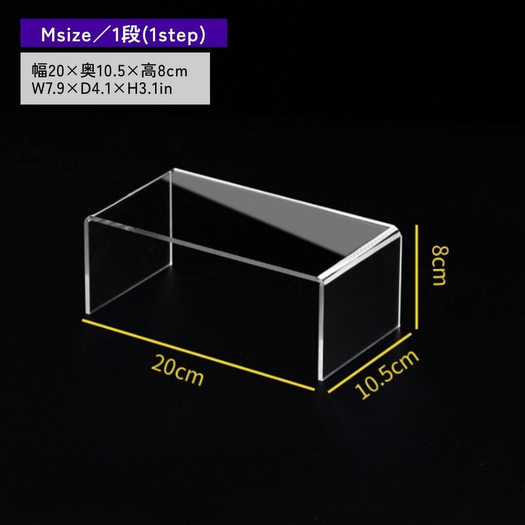 段差設計により後方のアイテムも隠れずにしっかり見える構造で、省スペースながらたっぷり陳列可能。アニメグッズやミニフィギュア、ガチャガチャのディスプレイにも最適です。